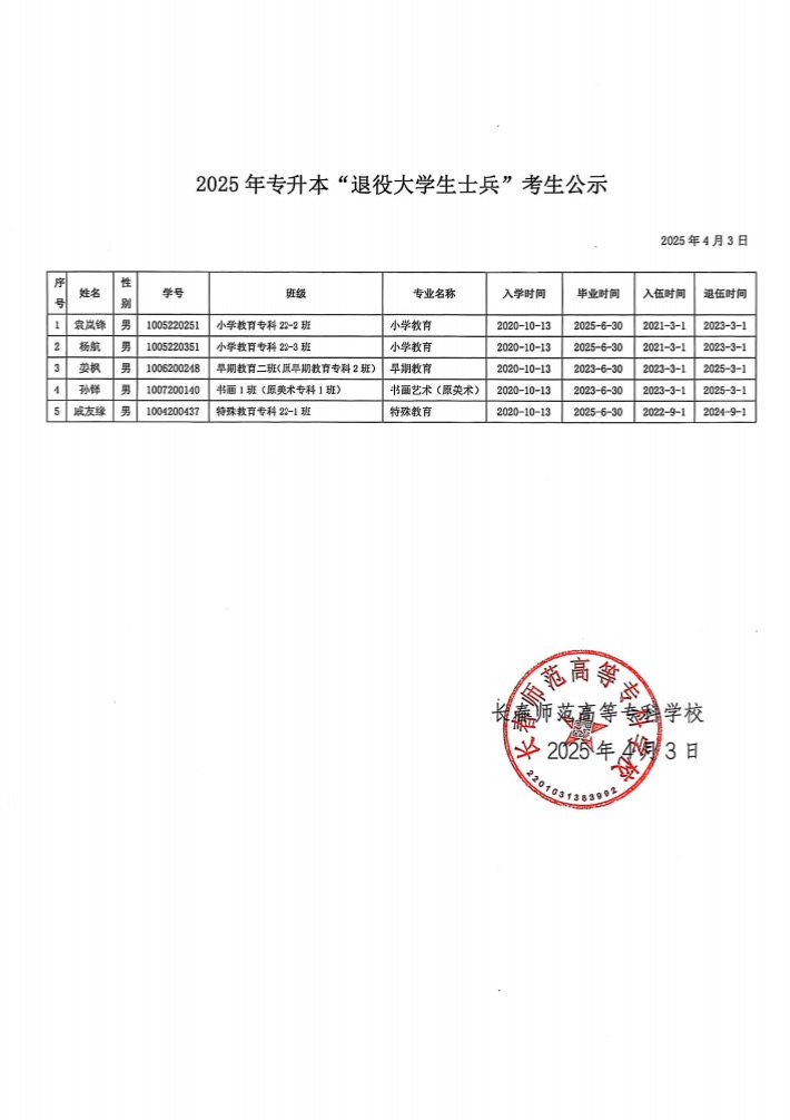 根据吉林省教育考试院吉教考〔2025〕7号文《关于做好吉林省2025年普通高等学校专升本考试招生工作的通知》文件要求,经学生申请,学院资格审查上报,学校复审,我校共有5名学生符合“退役大学生士兵”考生条件,现公示如下: